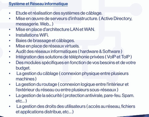 La SDSI est une société d’ingénierie et de services spécialisée en hautes technologies dans le domaine des télécoms, de la création et vente de logiciel, la GED et SAE et aussi l’Energie. Plus particulièrement, la SDSI propose des prestations axées sur l’intégration de l’ensemble des phases d’un projet.